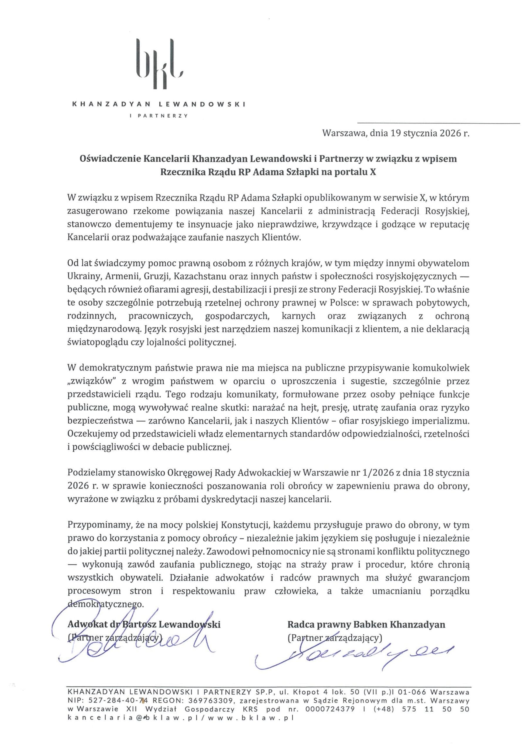 Oświadczenie Kancelarii Khanzadyan Lewandowski i Partnerzy w związku z wpisem Rzecznika Rządu RP Adama Szłapki na portalu X